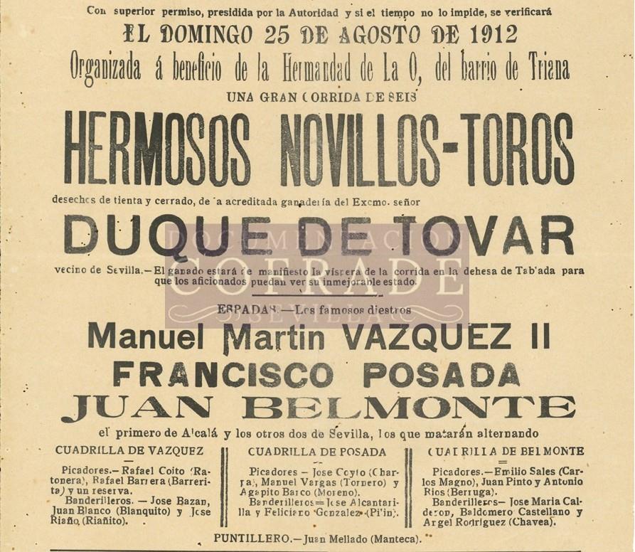 Hay 1 cartel más con el mismo título Corrida de Toros Hdad. Virgen de la O (1912) 1912 Ver detalle Medidas: Mediano (aprox. 50 cm. x 35 cm.). Edita: Plaza de Toros de Sevilla (Real Maestranza) Imprime: Imprenta Acuña (Sevilla)Formato: Original Fondos y ejemplares Rafael López-Campos Bodineau 1 Descripción Cartel de toros de corrida extraordiaria a beneficio de la Hermandad de la O, que tuvo lugar el 25 de agosto de 1912 en la Plaza de Toros de Sevilla. En la corrida intervinieron los matadores Manuel Martín Vázque... Palabras clave 01 Carteles 02 Carteles de texto 03 Corridas de toros 04 Hdad. Virgen de la O Ver detalle