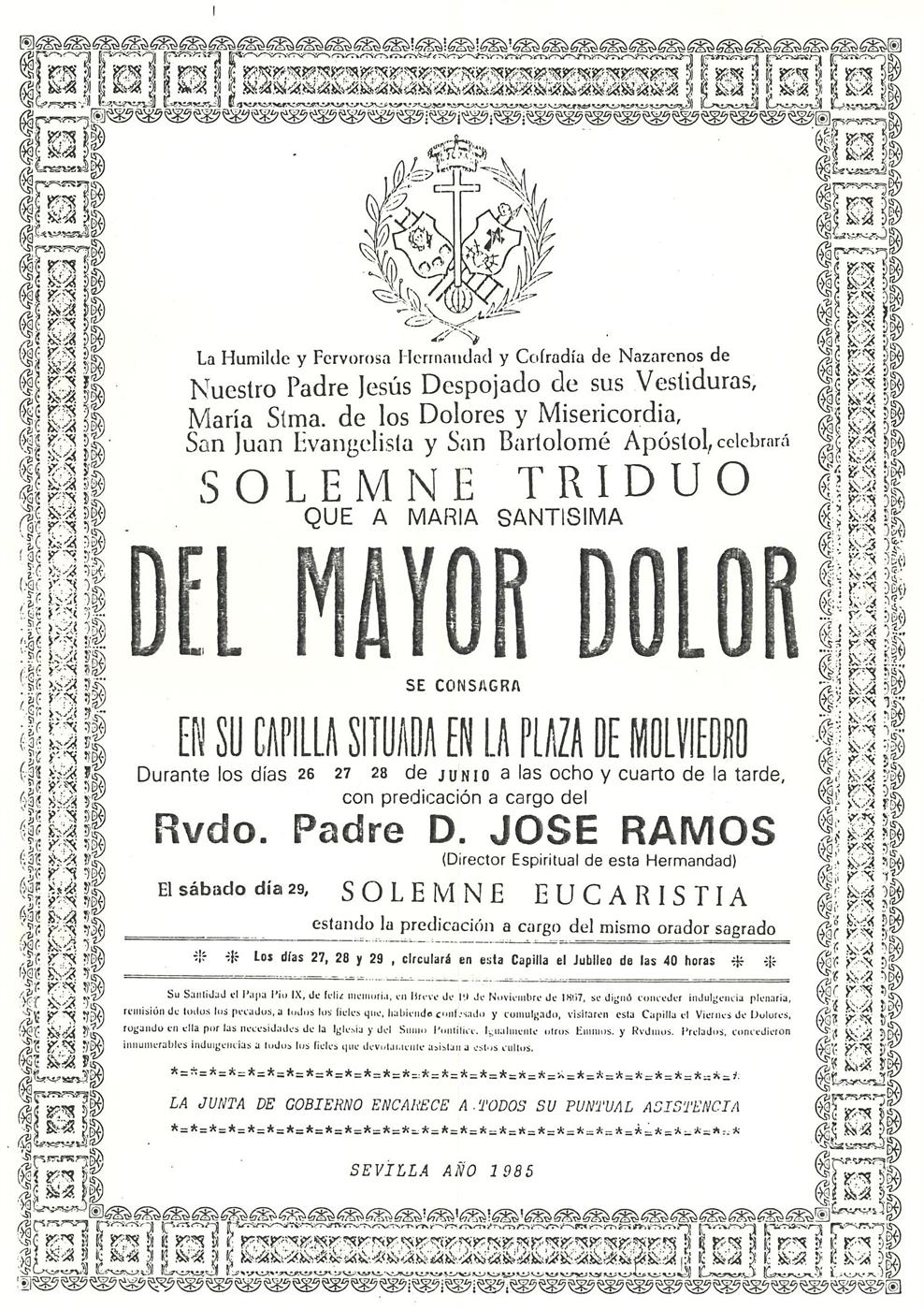 Función María Santísima del Mayor Dolor (1985) 1985 Ver detalle Medidas: Pequeño (Aprox. A4). Edita: Hermandad de Jesús Despojado Imprime: No figura impresorFormato: Original Fondos y ejemplares Rafael López-Campos Bodineau 1 Descripción Convocatoria de Triduo Anual y Función en honor de la imagen de María Santísima del Mayor Dolor (Hdad. Jesús Despojado) correspondiente al año 1985. El Triduo habría de tener lugar los días 26, 27 y 28... Palabras clave 01 Carteles 02 Carteles de texto 03 Convocatorias de cultos Ver detalle