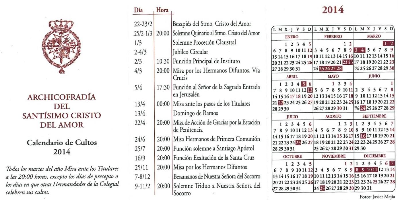 - Descripción: Calendario de cultos de la Hermandad del Amor correspondiente a todo el año 2014.