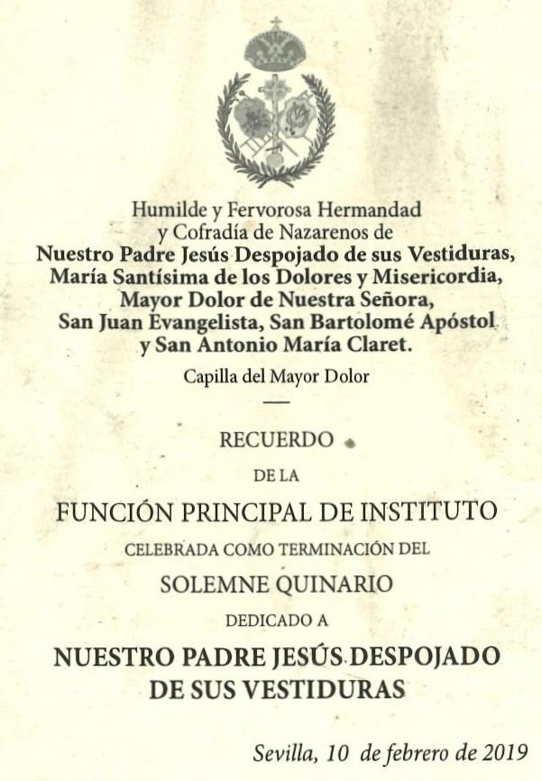 - Descripción: Recordatorio de la Funcion Principal de Instituto de la Hdad. Jesús Despojado correspondiente a 2019, que tuvo lugar el 10 de febrero de ese año. El documento, en formato estampa, muestra en el anverso una fotografía de la imagen de Jesús Despojado y en el reverso el recordatorio propiamente dicho.