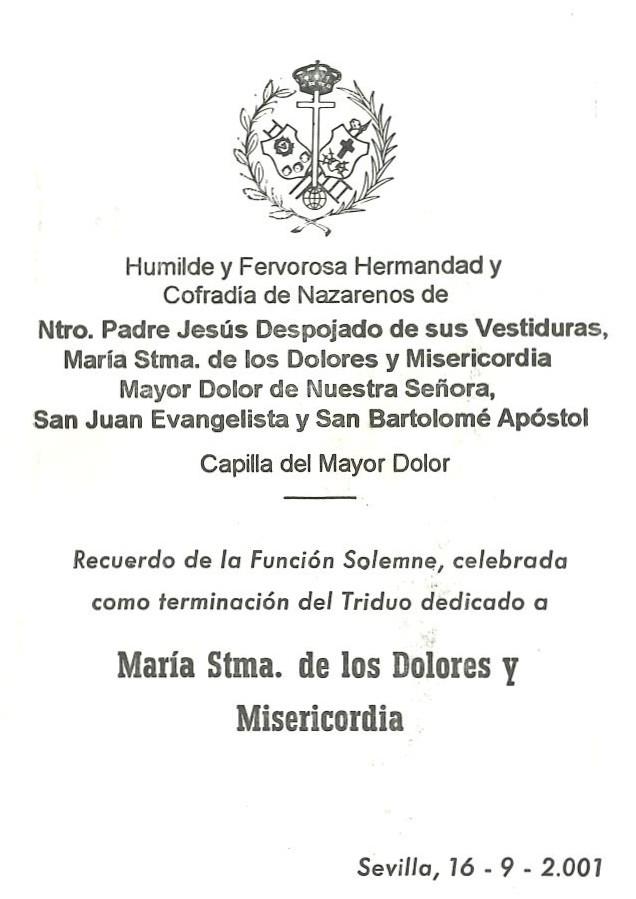 - Descripción: Recordatorio de la Funcion Anual en honor de María Santísima de los Dolores y Misericordia de la Hdad. Jesús Despojado correspondiente a 2001, que tuvo lugar el 16 de septiembre de ese año. El documento, en formato estampa, muestra en el anverso una fotografía de la imagen de María Santísima de los Dolores y Misericordia y en el reverso el recordatorio propiamente dicho.