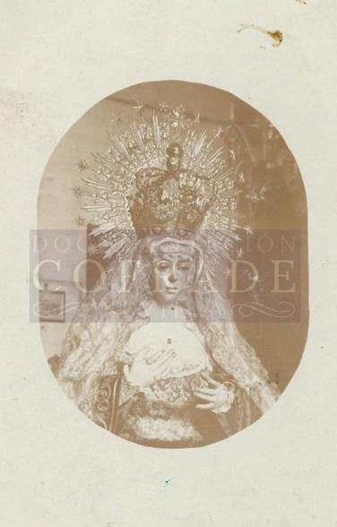 Postal de la serie 'Domínguez Sepia', editada por 'Domínguez', que muestra un primer plano de la imagen de María Santísima de la Esperanza Macarena en el interior de su camarín. ...