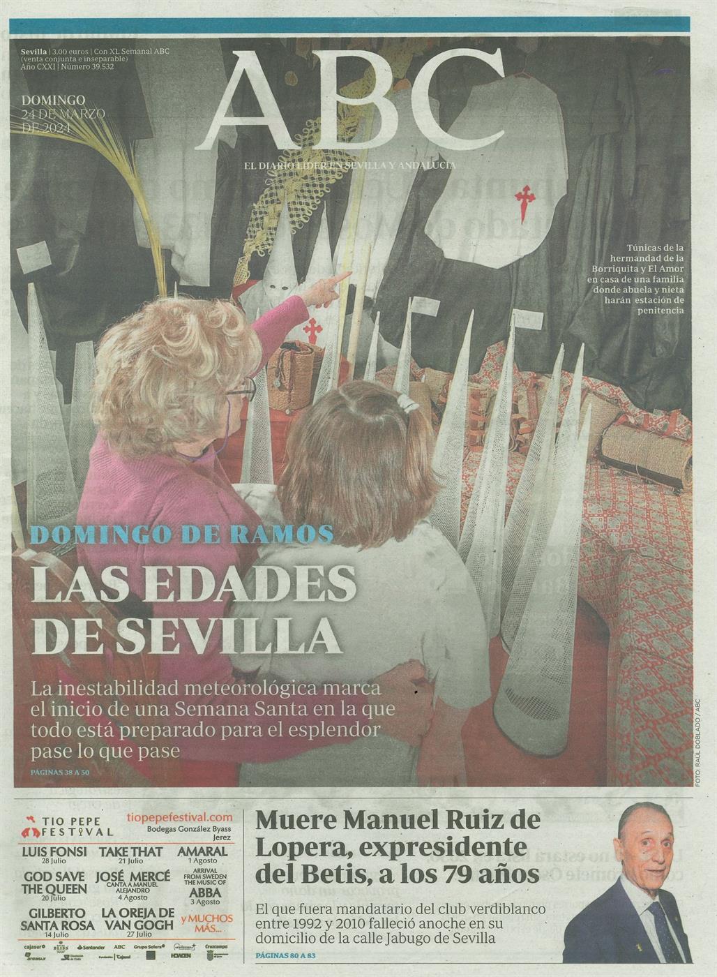 - Descripción: ABC de Sevilla correspondiente al 24 de marzo de 2024, Domingo de Ramos, en cuya portada figura un motivo de nuestra Semana Santa. Además de la portada, la pág. 2 recoge una instantánea de la salida del Cristo de los Desamparados del Santo Ángel del día anterior, las págs. 10 y 11 recogen una crónica gráfica de la jornada del Sábado de Pasión, la pág. 14 el artículo 'La Semana Santa como reto urbano' (Ignacio Camacho), las págs. 16 y 17 la entrevista 'A los bares se nos culpa de lo de la Madrugada y fueron el refugio de much gente' (Alfonso Maceda), y las págs. 38 a 50 una crónica detallada de la jornada anterior y una amplia sección informativa sobre aquel día de Domingo de Ramos.