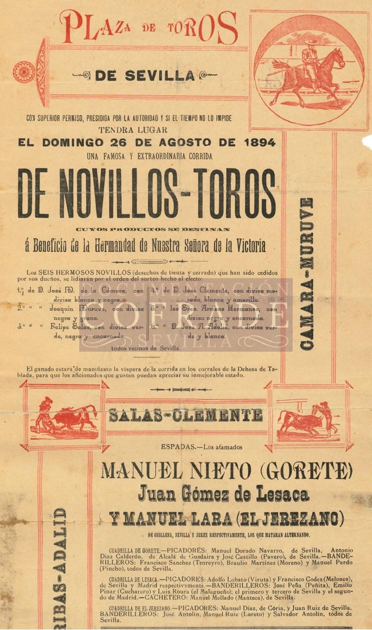 Corrida de Toros Hdad. Cigarreras (1894) 1894 Ver detalle Medidas: Mediano (aprox. 50 cm. x 35 cm.). Edita: Plaza de Toros de Sevilla (Real Maestranza) Imprime: Imprenta Carlos Acuña (Sevilla)Formato: Original Fondos y ejemplares Rafael López-Campos Bodineau 1 Descripción Cartel de toros de corrida extraordiaria a beneficio de la Hermandad de las Cigarreras, que tuvo lugar el 26 de agosto de 1894 en la Plaza de Toros de Sevilla. En la corrida intervinieron los matadores Manuel Nieto 'Gorete', J... Palabras clave 01 Carteles 02 Carteles de texto 03 Corridas de toros 04 Hdad. Cigarreras Ver detalle