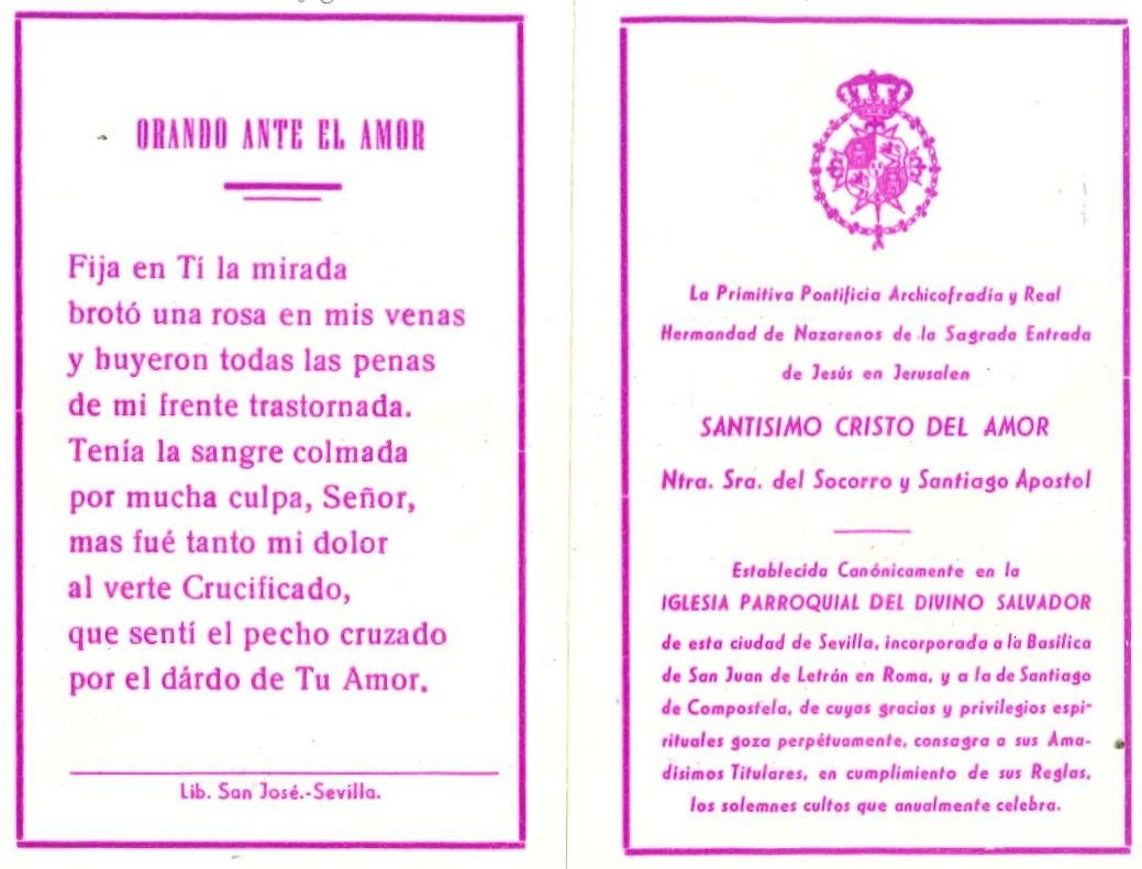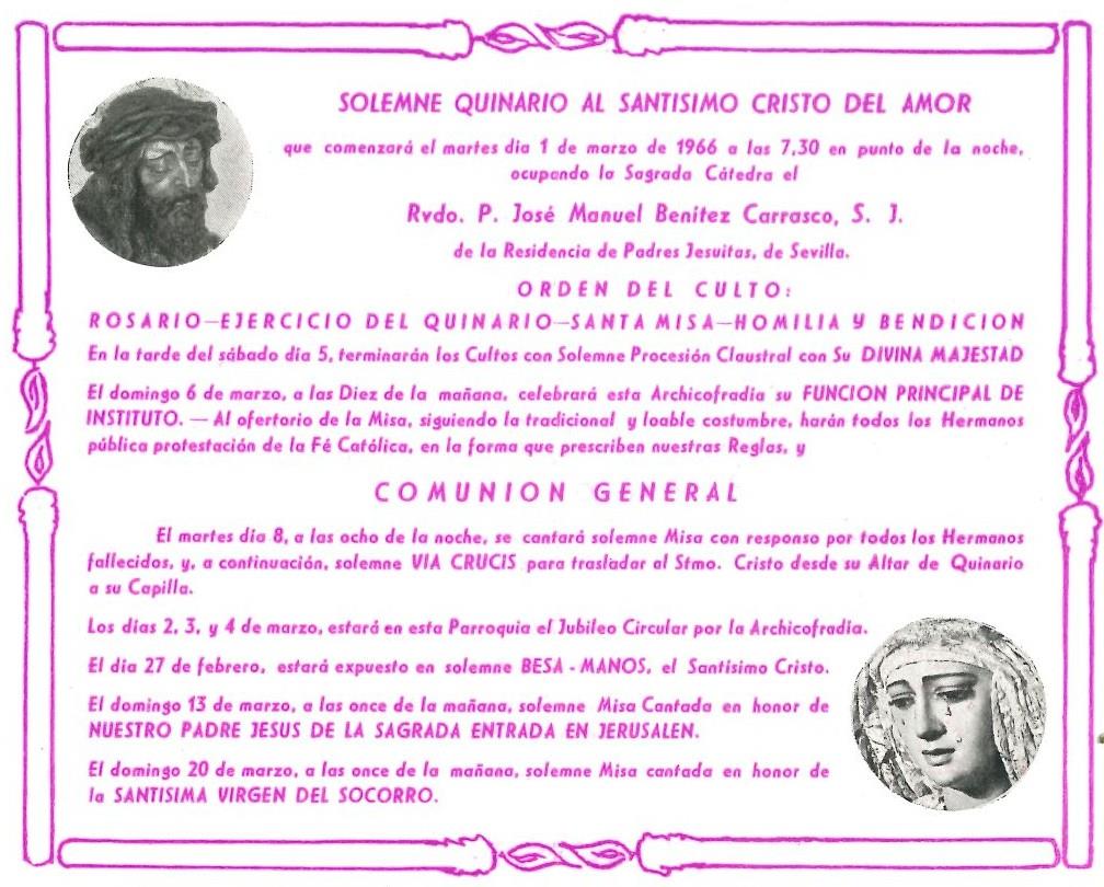- Descripción: Convocatoria de Solemne Quinario en honor de la imagen del Santísimo Cristo de Amor correspondiente al año 1966 y consiguiente Función Principal de Instituto. Los citados cultos tuvieron lugar los días 1 al 5 de marzo ambos inclusive en la Iglesia del Divino Salvador, con predicación a cargo del R. P. José Manuel Benítez Carrasco. La convocatoria también incluye referencia al resto de cultos cuaresmales, entre ellos la Solemne Función Anual al Señor de la Entrada en Jerusalén.