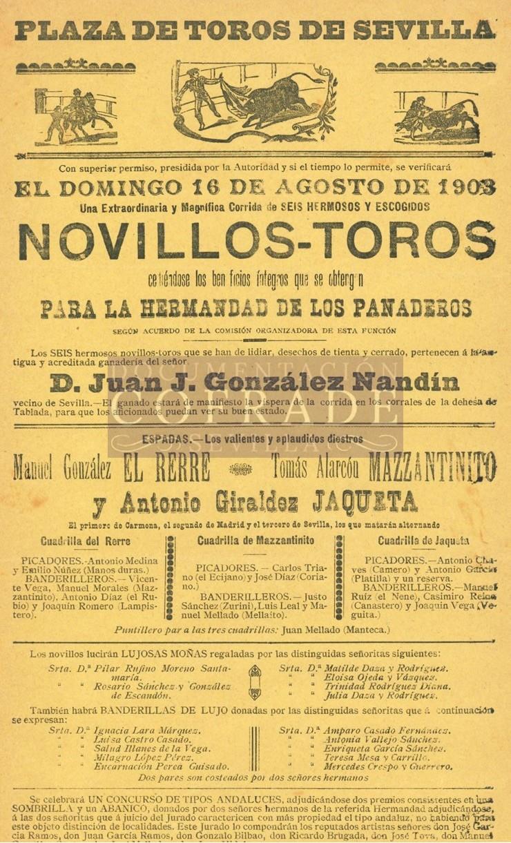 - Descripción: Cartel de toros de corrida extraordiaria a beneficio de la Hermandad del Prendimiento, que tuvo lugar el 16 de agosto de 1903 en la Plaza de Toros de Sevilla. En la corrida intervinieron los matadores Manuel González 'El Rerre', Tomás Alarcón 'Mazzantinito' y Antonio Giráldez 'Jaqueta'.
