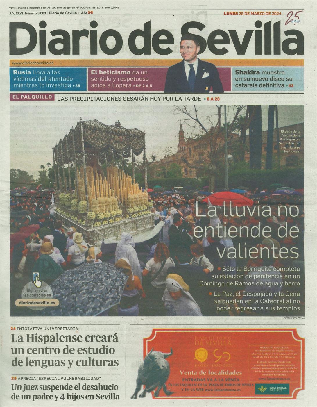 - Descripción: Diario de Sevilla correspondiente al 25 de marzo de 2024, Lunes Santo, en cuya portada figura una instantánea del paso de la Virgen de la Paz a su paso por el entorno de la Plaza de España. Además de la portada, el ejemplar recoge los artículos de opinión 'la ventana del Corral del Conde' (Carlos Navarro Antolín) en la pág. 2, 'La autoridad del Cautivo' (Carlos Colón) en pág. 3, 'Lluvia' (Carmen Oteo) en pág. 5, y la sección 'El palquillo' con la actualidad cofradiera de la jornada (pp. 6-23), entre otras cosas, la crónica de la jornada anterior y la programación de aquel Lunes Santo.