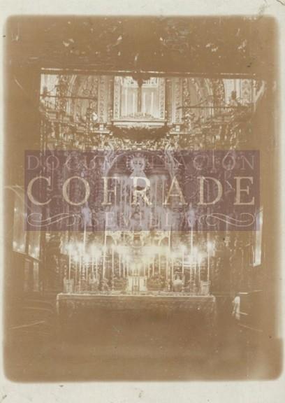 - Descripción: Postal editada por la Unión Universal de Correos, con reverso postal, que muestra una fotografía de la imagen de María Santísima de la Esperanza Macarena en su altar de culto diario, en su templo (Iglesia de San Gil). La postal no muestra año de edición, pero, por los elementos que aparecen en la fotografía, se ha consignado 1920 como fecha aproximada de edición. Asimismo, tampoco muestra numeración, por lo que se le ha otorgado el correspondiente al puesto en que la hermandad hace estación a la Santa Iglesia Catedral.
