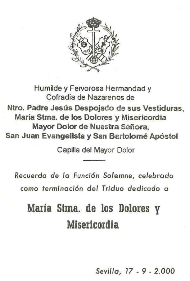 - Descripción: Recordatorio de la Funcion Anual en honor de María Santísima de los Dolores y Misericordia de la Hdad. Jesús Despojado correspondiente a 2000, que tuvo lugar el 17 de septiembre de ese año. El documento, en formato estampa, muestra en el anverso una fotografía de la imagen de María Santísima de los Dolores y Misericordia y en el reverso el recordatorio propiamente dicho.