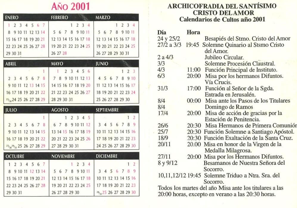 - Descripción: Calendario de cultos de la Hermandad del Amor correspondiente a todo el año 2001.