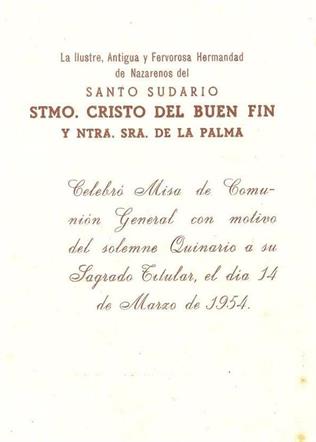 - Descripción: Recordatorio de la Funcion Principal de Instituto de la Hermandad del Buen Fin a 1954, que tuvo lugar el día 14 de marzo de ese año. El documento, en formato díptico, muestra en el anverso una fotografía de la imagen del Santísimo Cristo del Buen Fin y en el reverso el recordatorio propiamente dicho junto con el soneto 'Al Santísimo Cristo del Buen Fin' (Juan García Izquierdo).