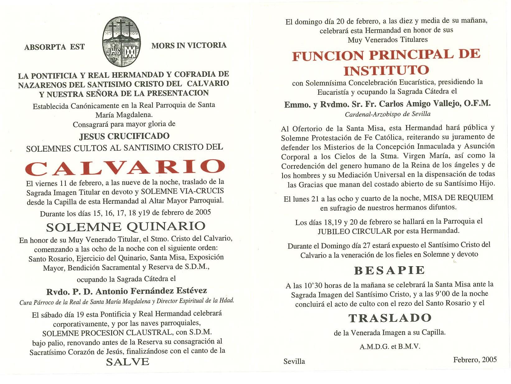 - Descripción: Convocatoria de Quinario Anual en honor de la imagen del Santísimo Cristo del Calvario correspondiente al año 2005, que tuvo lugar los días 15 al 19 de febrero de ese año con predicación a cargo del R P Antonio Fernández Estévez. El documento, en formato díptico, muestra en el anverso un dibujo de la imagen del Santísimo Cristo del Calvario, y en el reverso la convocatoria propiamente dicha.