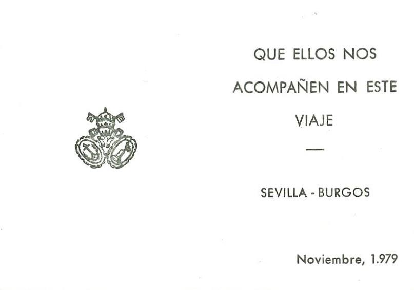 - Descripción: Recordatorio de la Peregrinación a Burgos correspondiente al año 1979, que tuvo lugar en noviembre de ese año. El documento, en formato estampa, muestra en el anverso sendas fotografías de las imágenes titulares de la corporación, y en el reverso el recordatorio propiamente dicho.