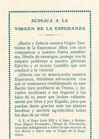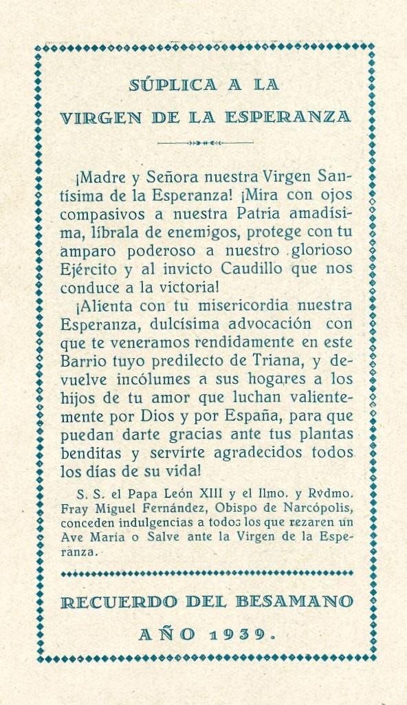 - Descripción: Recordatorio del Besamanos Anual a la imagen de la Virgen de la Esperanza correspondiente al año 1939. El documento, en formato estampa, muestra en el anverso una fotografía de la imagen de la Virgen de la Esperanza de Triana, y en el reverso el recordatorio propiamente dicho junto con una 'Súplica a la Virgen de la Esperanza' en la que la hermandad reza por España y por la situación por la que en aquel momento atravesaba el país.