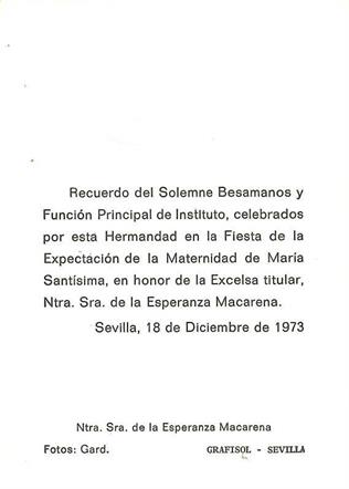 - Descripción: Recordatorio de la Funcion Anual en honor de la Virgen Esperanza Macarena con motivo de la festividad de la Expectación de la Virgen María, correspondiente al año 1973, que tuvo lugar el 18 de diciembre de aquel año. El documento, en formato estampa, muestra en el anverso una fotografía de la imagen de la Virgen Esperanza Macarena y en el reverso el recordatorio propiamente dicho.