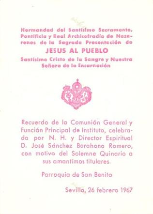 - Descripción: Recordatorio de la Funcion Principal de Instituto de la Hermandad de San Benito correspondiente al año 1967, que tuvo lugar el 26 de febrero de aquel año. El documento, en formato estampa, muestra en el anverso una fotografía de la imagen del Señor de la Presentación al Pueblo, y en el reverso el recordatorio propiamente dicho.