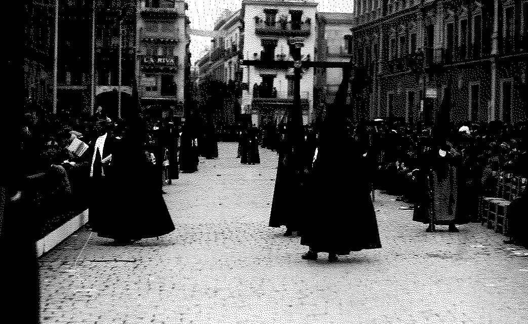- Descripción: Postal de la Serie 'Serrano', fotografiada y editada por el fotógrafo Juan José Serrano Gómez, con reverso postal, que muestra el cuerpo de nazarenos de la Hdad. San Bernardo a su paso por la Plaza de San Francisco. La postal no muestra año, pero, por los elementos que aparecen en la fotografía, se ha consignado 1930 como fecha aproximada de edición. Asimismo, tampoco muestra numeración, por lo que se le ha otorgado el correspondiente al puesto actual en que la hermandad hace estación a la Santa Iglesia Catedral.