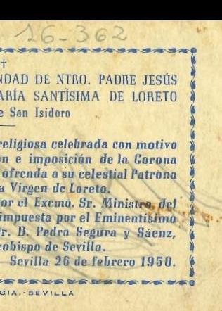 - Descripción: Recordatorio de la Funcion Extraordinaria organizada por la Hermandad de las Tres Caídas de San Isidoro con motivo de la imposición a la imagen de Nuestra Señora de Loreto de una corona donada por el Ejército del Aire, que tuvo lugar el 26 de febrero de 1950. El documento, en formato estampa, muestra en el anverso sendas fotografías de las imágenes titulares de la corporación y en el reverso el recordatorio propiamente dicho.