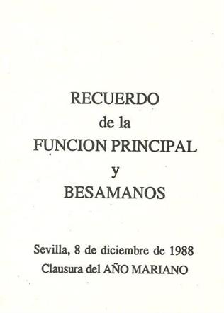 - Descripción: Recordatorio de la Funcion Anual en honor de María Santísima de la Concepción correspondiente al año 1988, que tuvo lugar el 8 de diciembre de ese año. El documento, en formato estampa, muestra en el anverso una fotografía de la imagen de la Virgen de la Concepción, y en el reverso el recordatorio propiamente dicho con alusión a la clausura del Año Mariano que en aquellos días estaba teniendo lugar.