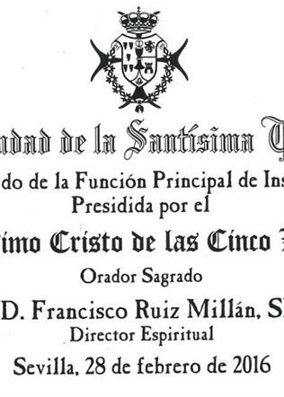 - Descripción: Recordatorio de la Funcion Principal de Instituto de la Hdad. Trinidad correspondiente al año 2016, que tuvo lugar el 28 de febrero de ese año. El documento, en formato estampa, muestra en el anverso una fotografía de la imagen del Santísimo Cristo de las Cinco Llagas, y en el reverso el recordatorio propiamente dicho junto con la imagen corporativa de la hermandad.