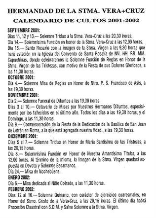 - Descripción: Calendario de cultos de la Hermandad de Vera Cruz correspondiente al año 2001-2002.