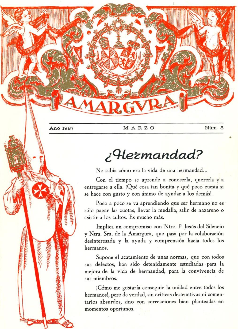 - Descripción: Boletín de la Hermandad de la Amargura que recoge los siguientes contenidos: ¿Hermandad? (Una hermana) // Insignias de la cofradía de San Juan de la Palma (José Ortiz Díaz) // Paso de palio // Hace 50 años // Avisos y noticias // La Amargura es parte de mi vida (José Luis Peinado) // Perfil 'en blanco' de un pregón // Manuel Font de Anta // Avisos y noticias // Estación de penitencia (José Vicente Corona) // Dentro de poco... (Francisco José Vázquez) // El Niño Jesús de la hermandad (Juan Martínez Alcalde) // Poema 'A Nuestra Señora de la Amargura' (Francisco Gómez Gascó).