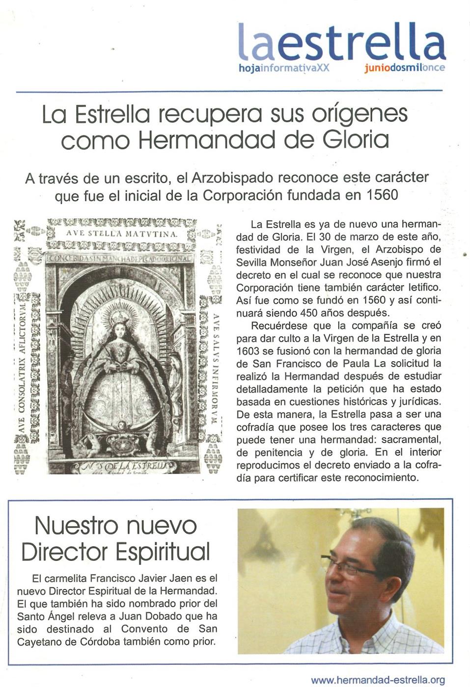 - Descripción: Hoja Informativa de la Hermandad de la Estrella que recoge diversos avisos breves y noticias correspondientes a junio del año 2011.