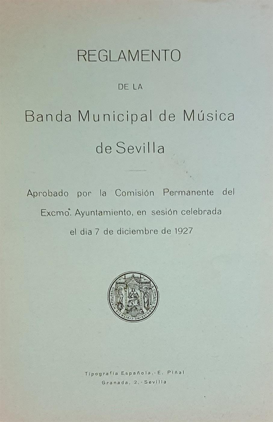 Reglamento de la Banda Municipal de Música de Sevilla (Autores Varios), AAVV 1927 (1ª Edición) Ver detalle Nº de páginas: 121ª Edición: 1927 Edita: Ayuntamiento de Sevilla Imprime: Tipografía EspañolaFormato: Original Fondos y ejemplares Rafael López-Campos Bodineau 1 Descripción Reglamento de la Banda Municipal de Música de Sevilla aprobado por la Comisión Permanente del Excmo. Ayuntamiento de Sevilla, en sesión celebrada el día 7 de diciembre de 1927. Palabras clave 02 Hermandades y Cofradías 02 Sevilla 04 Reglas, Normativas 05 Música Ver detalle