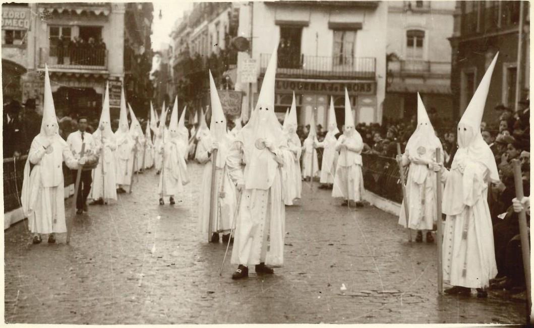 - Descripción: Postal editada por Agfa, con reverso postal, que muestra una fotografía del cuerpo de nazarenos de la Hdad. Negritos en el momento de transitar por la Plaza de San Francisco. La postal no muestra año de edición, pero, por los elementos que aparecen en la fotografía, se ha consignado 1920 como fecha aproximada de edición. Asimismo, tampoco muestra numeración, por lo que se le ha otorgado el correspondiente al puesto en que la hermandad hace estación a la Santa Iglesia Catedral.