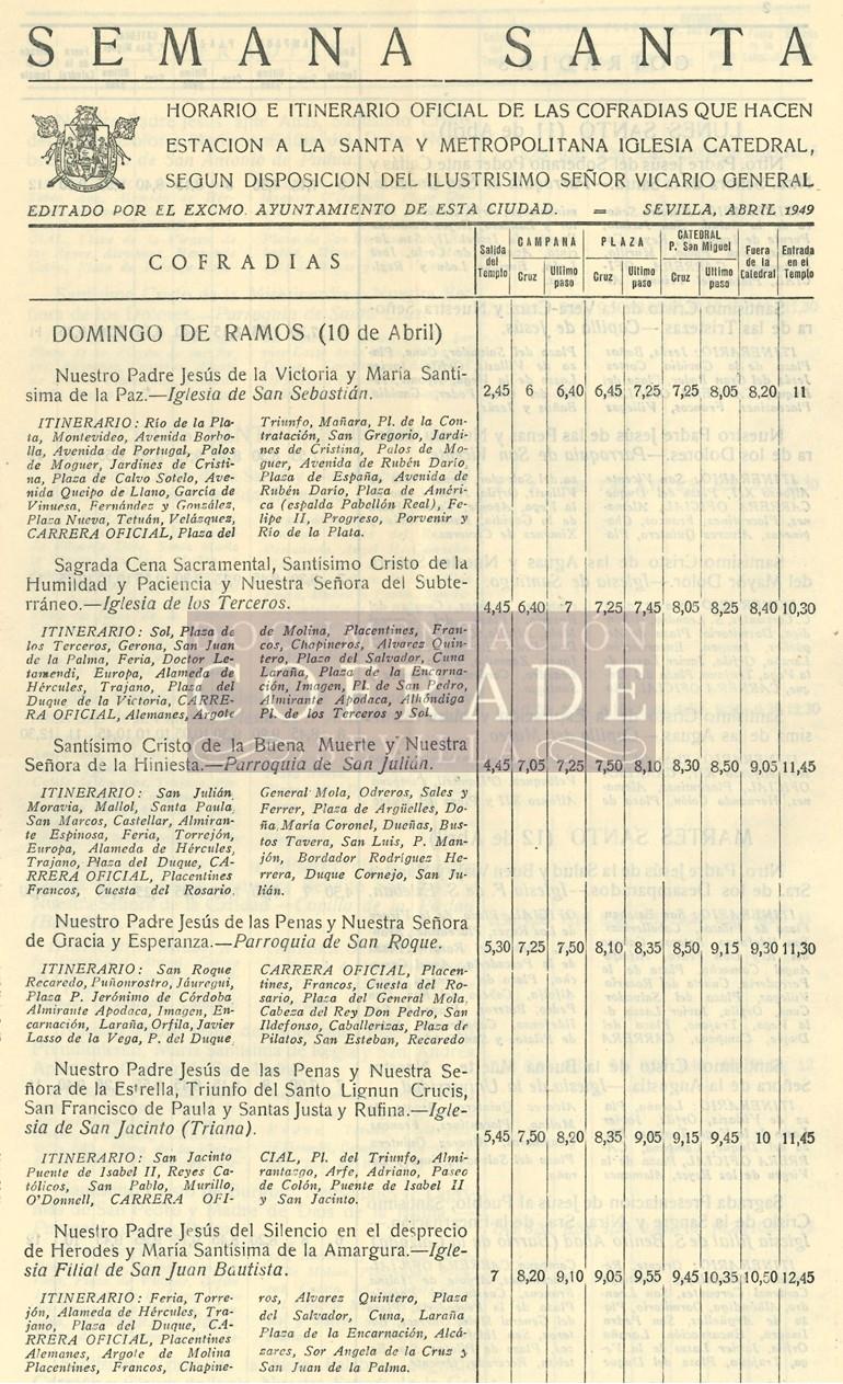- Descripción: Nómina Oficial de las Cofradías que habrían de hacer la estación de penitencia a la Santa Iglesia Catedral, en la Semana Santa de 1949. Aquel año fueron 48 las hermandades que realizaron su estación de penitencia a la Santa Iglesia Catedral; las siguientes: Domingo de Ramos (Hdad. Paz, Hdad. Sagrada Cena, Hdad. Hiniesta, Hdad. San Roque, Hdad. Estrella, Hdad. Amargura, Hdad. Amor), Lunes Santo (Hdad. San Gonzalo, Hdad. Vera Cruz, Hdad. Penas de San Vicente, Hdad. Aguas, Hdad. Museo), Martes Santo (Hdad. San Esteban, Hdad. Estudiantes, Hdad. San Benito, Hdad. Candelaria, Hdad. Dulce Nombre, Hdad. Santa Cruz), Miércoles Santo (Hdad. San Bernardo, Hdad. Buen Fin, Hdad. Baratillo, Hdad. Prendimiento, Hdad. Cristo de Burgos, Hdad. Siete Palabras, Hdad. Sagrada Lanzada), Jueves Santo (Hdad. Trinidad, Hdad. Negritos, Hdad Exaltación, Hdad. Cigarreras, Hdad. Montesión, Hdad. Quinta Angustia, Hdad. Valle, Hdad. Pasión), Viernes Santo Madrugada (Hdad. Jesús Nazareno, Hdad. Gran Poder, Hdad. Macarena, Hdad. Calvario, Hdad. Esperanza de Triana, Hdad. Gitanos), Viernes Santo Tarde (Hdad. Carretería, Hdad. Soledad de San Buenaventura, Hdad. Expiración de Triana, Hdad. Virgen de la O, Hdad. Tres Caídas de San Isidoro, Hdad. Montserrat, Hdad. Sagrada Mortaja, Hdad. Santo Entierro, Hdad. Soledad de San Lorenzo).