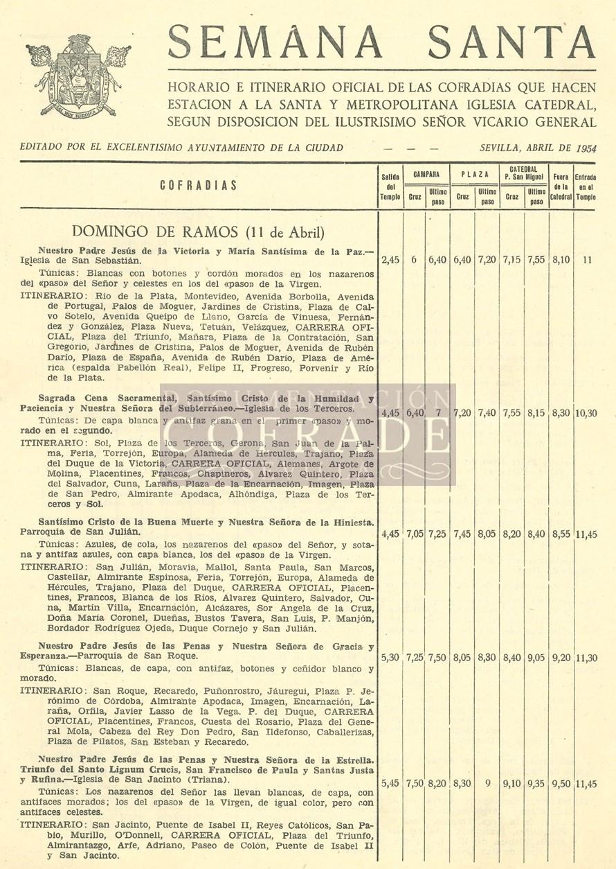 - Descripción: Nómina Oficial de las Cofradías que habrían de hacer la estación de penitencia a la Santa Iglesia Catedral, en la Semana Santa de 1954. Aquel año fueron 49 las hermandades que realizaron su estación de penitencia a la Santa Iglesia Catedral; las siguientes: Domingo de Ramos (Hdad. Paz, Hdad. Sagrada Cena, Hdad. Hiniesta, Hdad. San Roque, Hdad. Estrella, Hdad. Amargura, Hdad. Amor), Lunes Santo (Hdad. Santa Marta, Hdad. San Gonzalo, Hdad. Vera Cruz, Hdad. Penas de San Vicente, Hdad. Aguas, Hdad. Museo), Martes Santo (Hdad. San Esteban, Hdad. Estudiantes, Hdad. San Benito, Hdad. Candelaria, Hdad. Dulce Nombre, Hdad. Santa Cruz), Miércoles Santo (Hdad. San Bernardo, Hdad. Buen Fin, Hdad. Baratillo, Hdad. Prendimiento, Hdad. Cristo de Burgos, Hdad. Siete Palabras, Hdad. Sagrada Lanzada), Jueves Santo (Hdad. Trinidad, Hdad. Negritos, Hdad Exaltación, Hdad. Cigarreras, Hdad. Montesión, Hdad. Quinta Angustia, Hdad. Valle, Hdad. Pasión), Viernes Santo Madrugada (Hdad. Jesús Nazareno, Hdad. Gran Poder, Hdad. Macarena, Hdad. Calvario, Hdad. Esperanza de Triana, Hdad. Gitanos), Viernes Santo Tarde (Hdad. Carretería, Hdad. Soledad de San Buenaventura, Hdad. Expiración de Triana, Hdad. Virgen de la O, Hdad. Tres Caídas de San Isidoro, Hdad. Montserrat, Hdad. Sagrada Mortaja, Hdad. Santo Entierro, Hdad. Soledad de San Lorenzo).