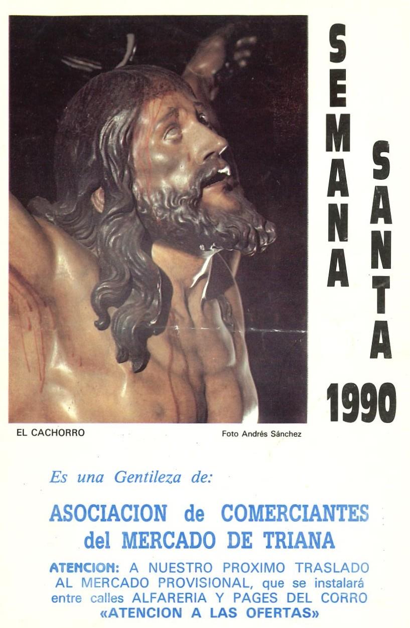 - Descripción: Programa de Mano, editado por la Asociación de Comerciantes de Triana, en el que se da cuenta de las hermandades que en 1990 habrían de hacer estación de penitencia a la Santa Iglesia Catedral. El programa recoge un tabla por cada jornada de la Semana Santa, con indicación en el caso de cada hermandad de su denominación, templo del que sale, e itinerario completo que habría de seguir.
