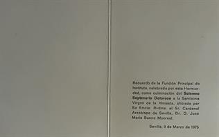 - Descripción: Recordatorio de la Función Principal de Instituto de la Hermandad de la Hiniesta, celebrada el 9 de marzo de 1975 en la Iglesia de San Julián, y oficiada por el R. P. José María Bueno Monreal.