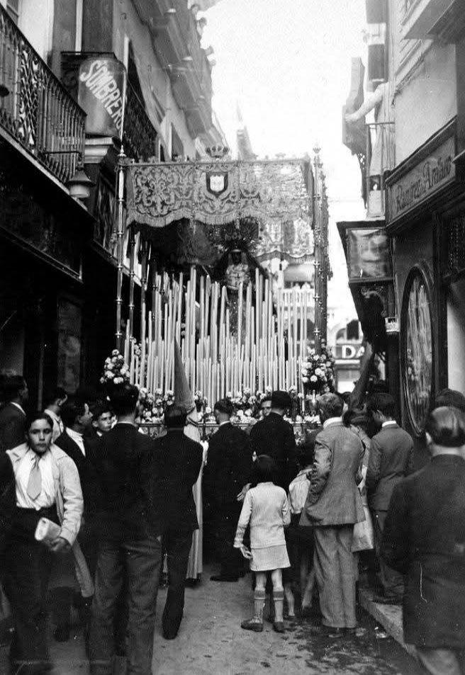 - Descripción: Fotografía del paso de María Santísima Madre de los Desamparados, correspondiente al 15 de abril de 1930, Martes Santo, en el momento de transitar por la calle Córdoba, en su recorrido de ida hacia la Carrera Oficial.